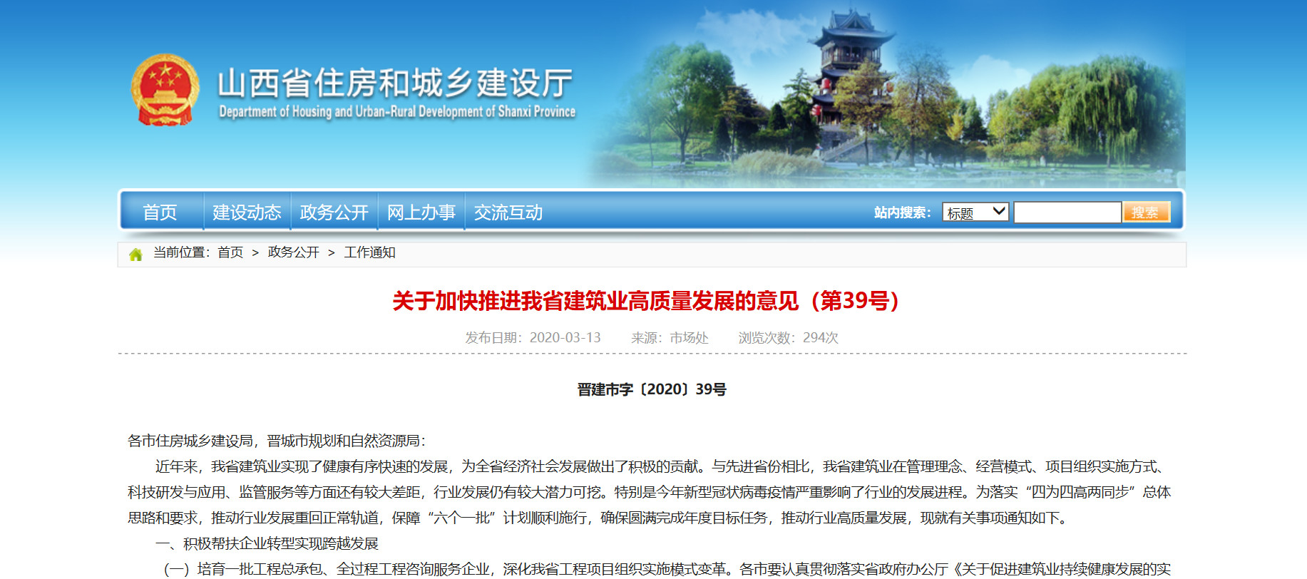 2020年3月13日,山西省住房和城鄉(xiāng)建設(shè)廳發(fā)布了《關(guān)于加快推進(jìn)我省建筑業(yè)高質(zhì)量發(fā)展的意見(jiàn) 》晉建市字〔2020〕39號(hào),文中強(qiáng)調(diào):