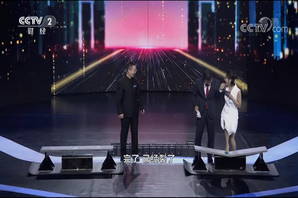 去年央視《創業英雄會》來西安選人,今年8月10日,鄧明科團隊去北京錄制節目,節目10月9日播出。節目現場,鄧明科準備了一塊普通混凝土板、一塊高延性混凝土板和500公斤的砝碼,進行了加載對比實驗。